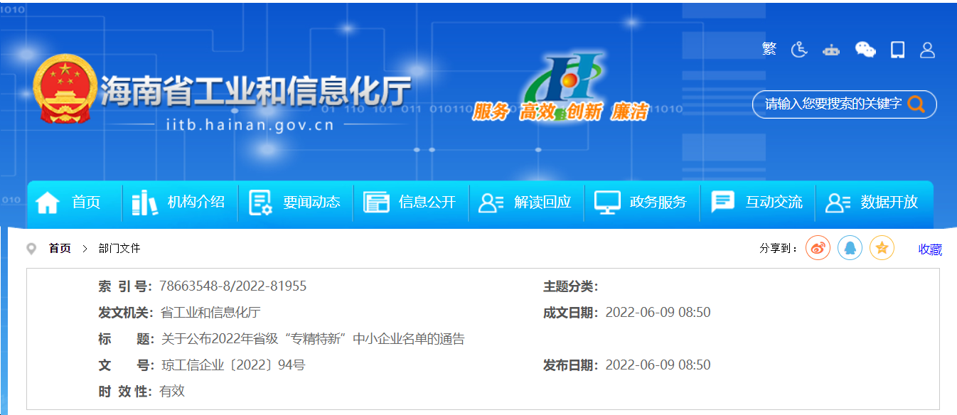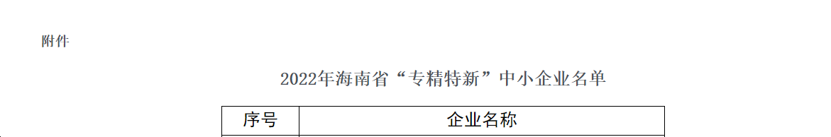 海南省工業(yè)和信息化廳 關(guān)于公布2022年省級“專精特新” 中小企業(yè)名單的通告